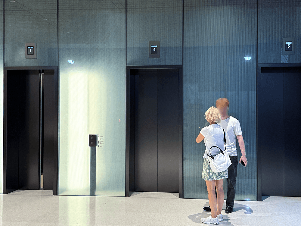 旧「Apple 銀座」では奥に2台、回数ボタンがないエレベーターがあったのですが、新「Apple 銀座」は入口右側にエレベーターが3台設置になりました。
