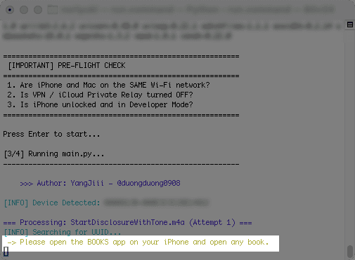 順調に進み「Please open the BOOKS app on your iPhone and open any book.」と表示されました。