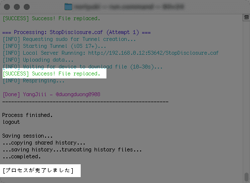 「[SUCCESS] Success! File replaced.」が表示されて、その後「プロセス完了」が表示されました。