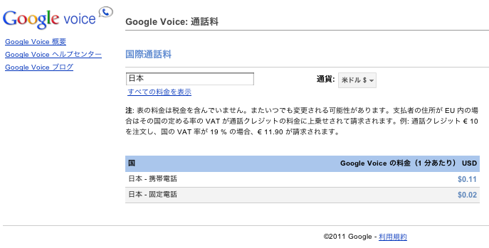これに対して「Google Voice」の通話料金は、固定電話へは0.02ドル/分、携帯電話へは0.11ドル/分です。最近は円高ドル安なので1ドル=75円で計算すると、固定電話へは1.5円/分、携帯電話へは8.25円/分となります!