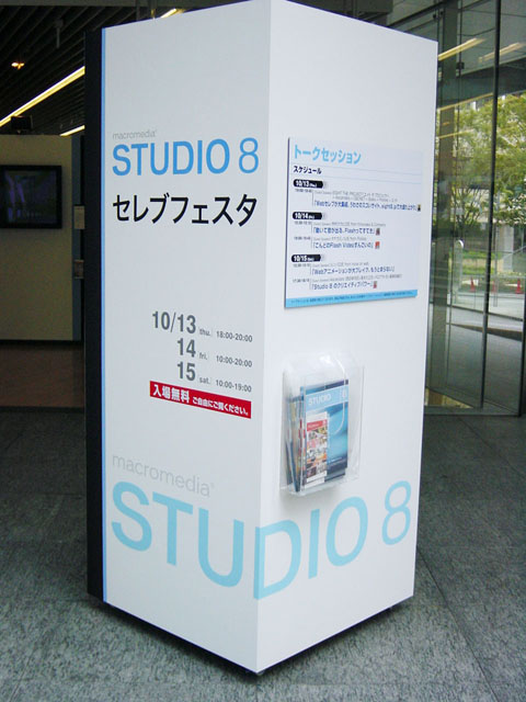 昨日の夜、「MACお宝鑑定団」のWebサイトで macromediaが 東京・六本木ヒルズのテレビ朝日内1階の多目的スペース「umu(ウム)」で「STUDIO 8 セレブフェスタ」を 10月13日から15日まで開催しているのを知りました。12日に日本版が出た「STUDIO 8」の紹介イベントです。 明日が最終日です。朝イチで行くことに決めました。