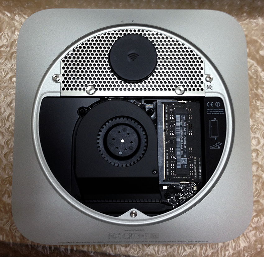 「Mac mini」2012年モデルを開封したら、まずメモリーの交換です。「Mac mini」2012年モデルの構造は2011年モデルとまったく同じなので、メモリーの交換は底面の蓋を回して外すだけで簡単に作業出来ます。