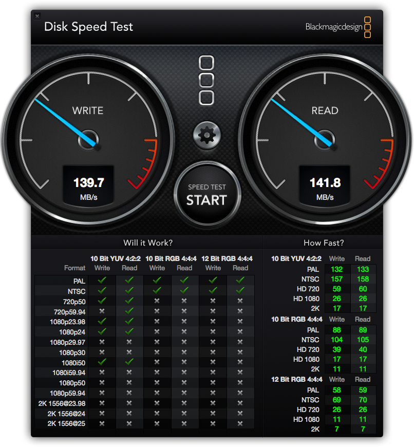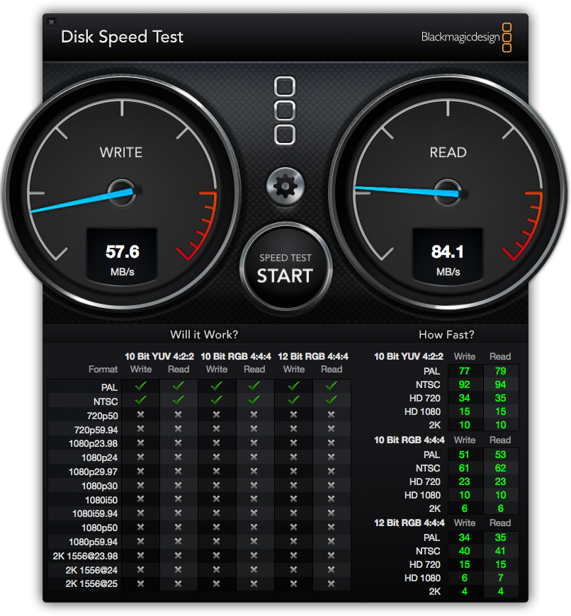 結果は、FireWire800が「WEITE 69.5MB/S、READ 81.1MB/S」、USB3.0が「WEITE 57.6MB/S、READ 84.1MB/S」でした。FireWire800でもUSB3.0でも数値がほぼ同じです。