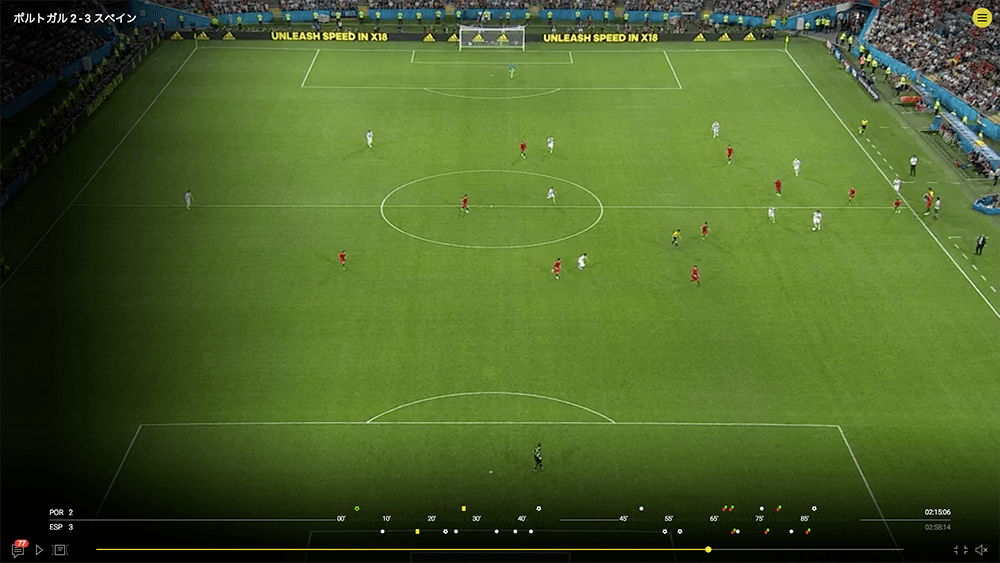 ピッチ全面が常に表示されているので両チームのシステム、各選手の移動するポジショニングなどがモノの見事に見えます。