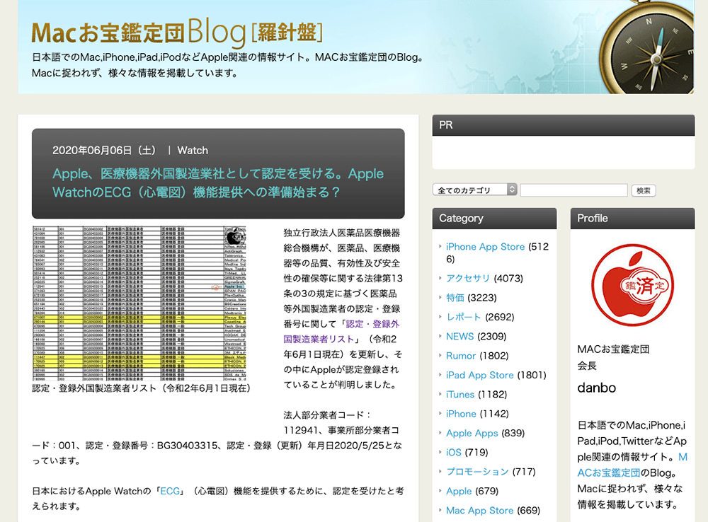 「MACお宝鑑定団 blog(羅針盤)」は「Apple」が日本で医薬品等外国製造業者の認定・登録番号を取得したとの情報を報じました。