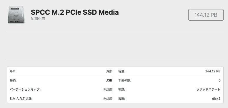 「ディスクユーティリティー」上では「Silicon Power SSD」を認識していましたが、最初にフォーマットした際に付けた名称が消え、意味不明な番号に代わっています。