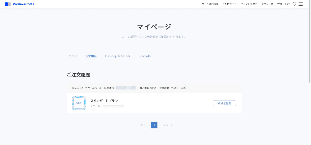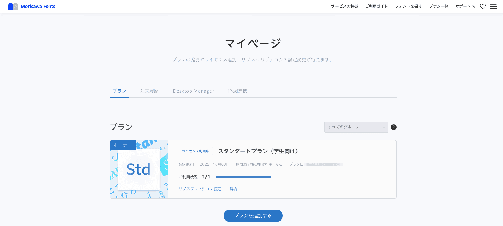 「Morisawa Fonts スタンダードプラン」の契約が完了したら「Morisawa Font」の「マイページ」内の「Desktop Manager」タブから「Desktop Manager」インストーラーをダウンロードします。