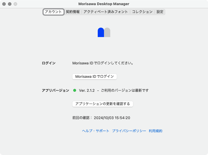 「ステータスメニュー」に表示された「Morisawa Desktop Manager」アイコンをクリックし起動、「Morisawa ID」でログインします。