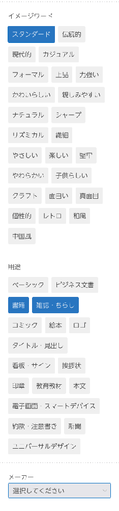 「メーカー」は「モリサワ」、「SCREEN GA」、「字游工房」、「用途」は「書籍」、「雑誌・ちらし」、「イメージワード」は「スタンダード」をそれぞれ選択。