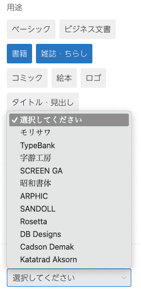 また、明朝、ゴシックなどの書体の種類の他、「用途」で書籍、チラシ、スマートデバイスなど使用用途にフォントを絞り込みことができます。